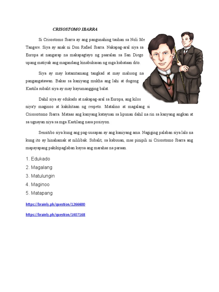 Si Juan Crisostomó Ibárra y Magsálin o Crisostomo o Ibarra ay isang binatang nag-aral sa Europa. Play this game to review Other. 8 Sadyang kailangan tayong kalabanin at gisingin upang malantad ang ating mga kasamaan at kahinaan sa ganitoy lalo.