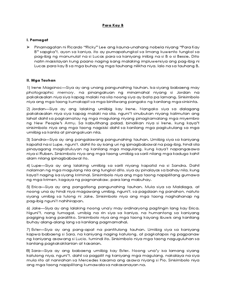Nobelang para kay b tauhan. Para Kay B ni Ricky Lee Updated on June 2 2020 3 minutes read. Para kay Francisco ang lahat ay dapat tuklasin sa isang babae. Ang nobelang ito ay nagsasalaysay ng pagbabago at pagaangat ng kalayaan sa isang lipunan.