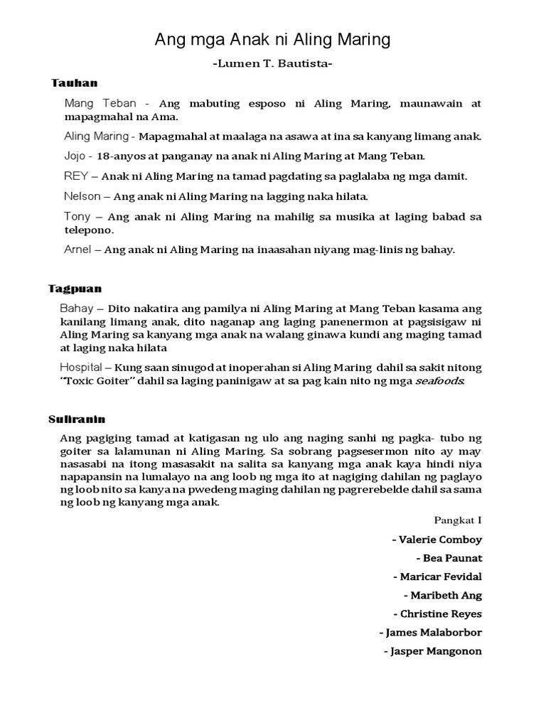 Siya ay isa sa mga anak nina Anggoy Alunsina at Buyung Pabauri. KATANGIAN AT PAPEL NG MGA TAUHAN. Sa Ang Paglilitis ni Mang Serapio binulag ang kawawang pulubi.