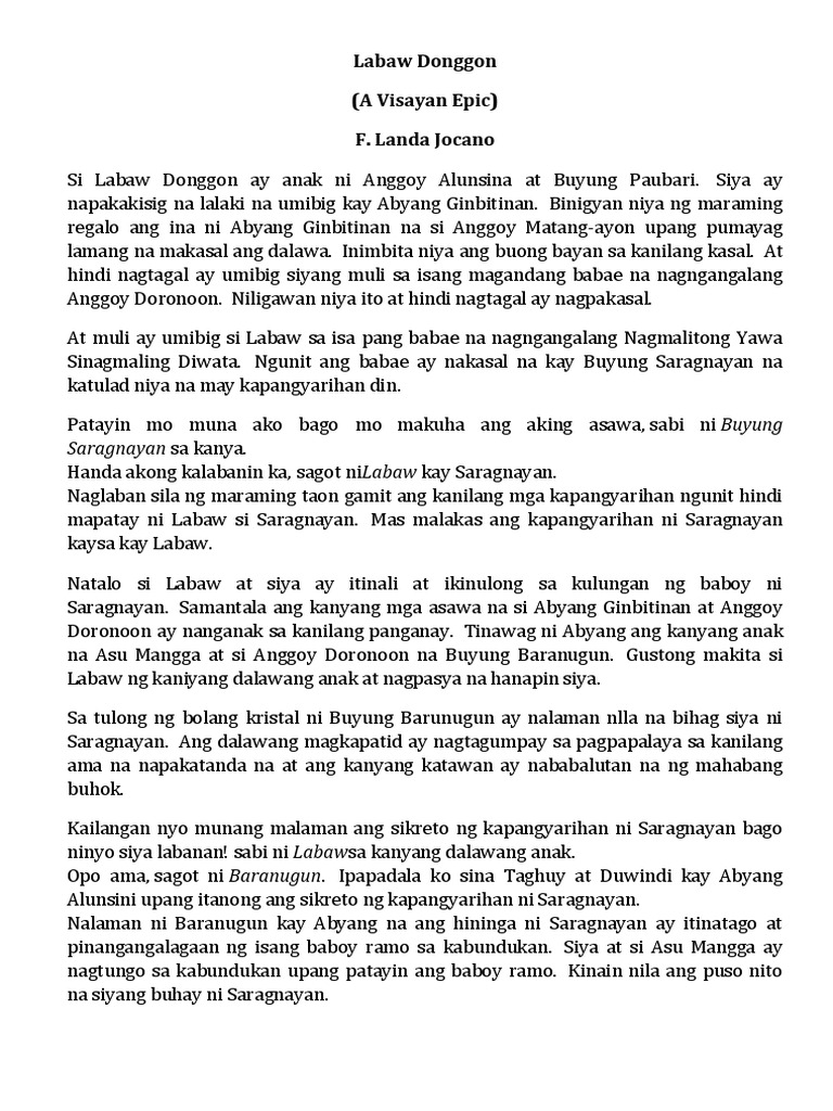 Mga kapatid niya sina Humadapnon at. MGA TAUHAN 1Buyung Datu Paubari - Mabuting pinuno ng Halawod - Kabiyak ni Alunsina - Ama ng tatlong prinsipe 2Alunsina Ang bathalang babaing napangasawa ni Datu Paubari - Ina ng tatlong prinsipe - Lubos na mahal ang kanyang pamilya at handing magsakripisyo 3Labaw Donggon Panganay na anak ni Abyang Alunsina Mahilig sa. 1 question Ano ang mga Kalagayang Panlipunan ng mga taga-Visayas sa kwentong Labaw Donggon.