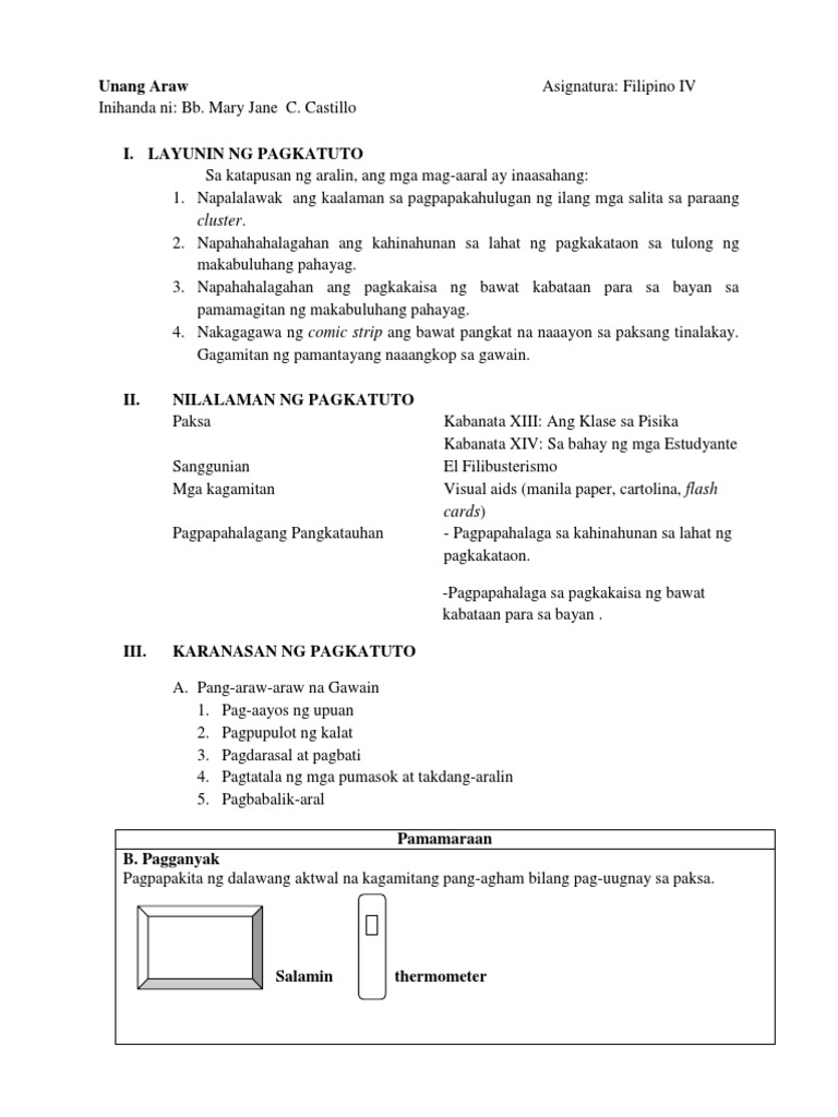 Banghay-Aralin -Isang executive ang titser. Ortega Memorial Iriga City JUNIOR HIGH SCHOOL DEPARTMENT MALA-MASUSING BANGHAY ARALIN SA FILIPINO IKASAMPUNG BAITANG ILAYUNIN Sa loob ng isang oras 1 ang mga mag-aaral ay inaasahang. 0 ratings 0 found this document useful 0 votes 4 views 15 pages.